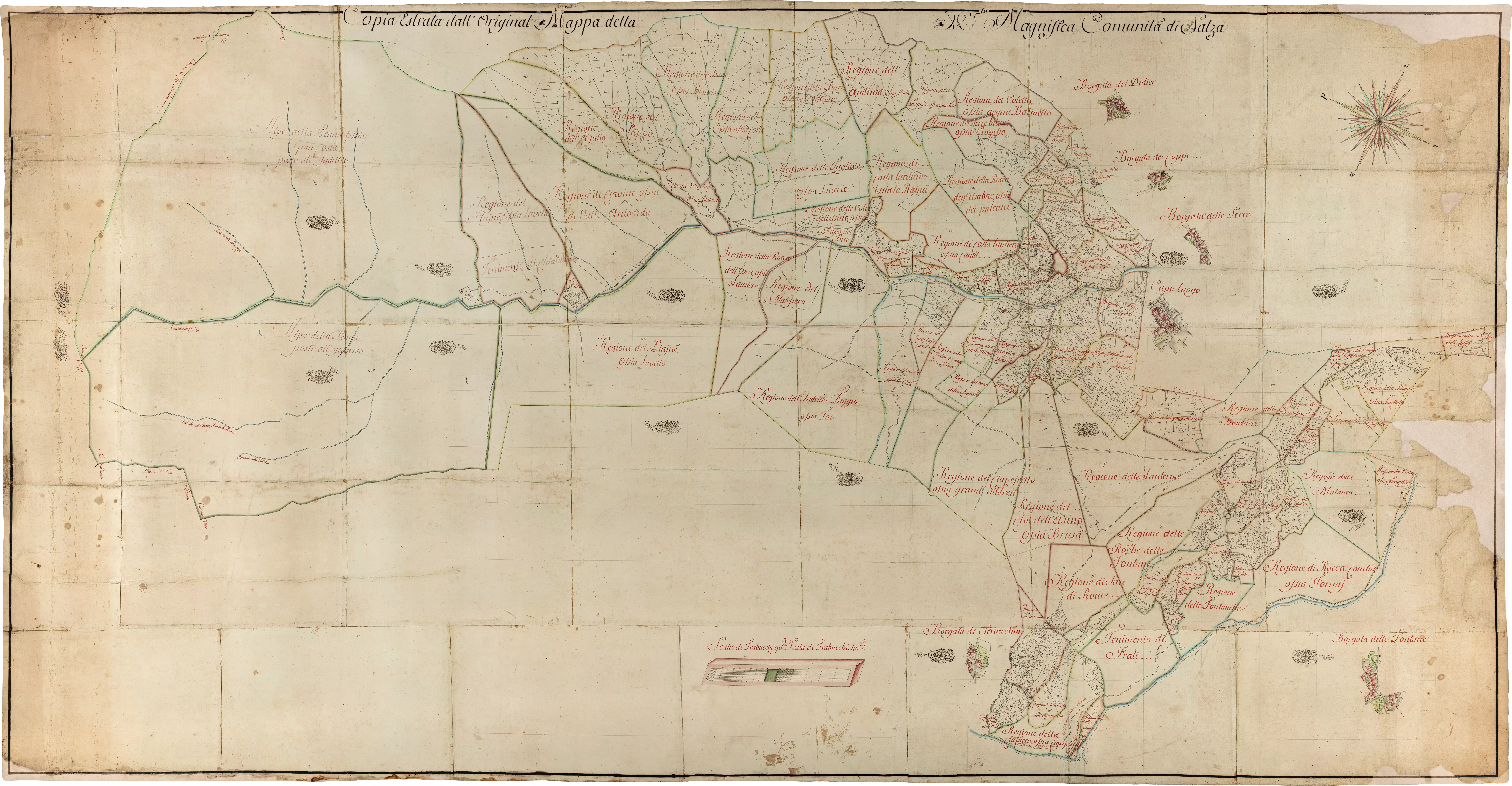 Abbiamo scelto questa mappa del 1700 perchè era tra i documenti storici più deteriorati presenti nel nostro archivio e siamo andati alla ricerca del relativo volume catastale perchè sono due documenti complementari che ahnno bisogno di essere letti insieme per restituire un quadro storico più completo e approfondito.