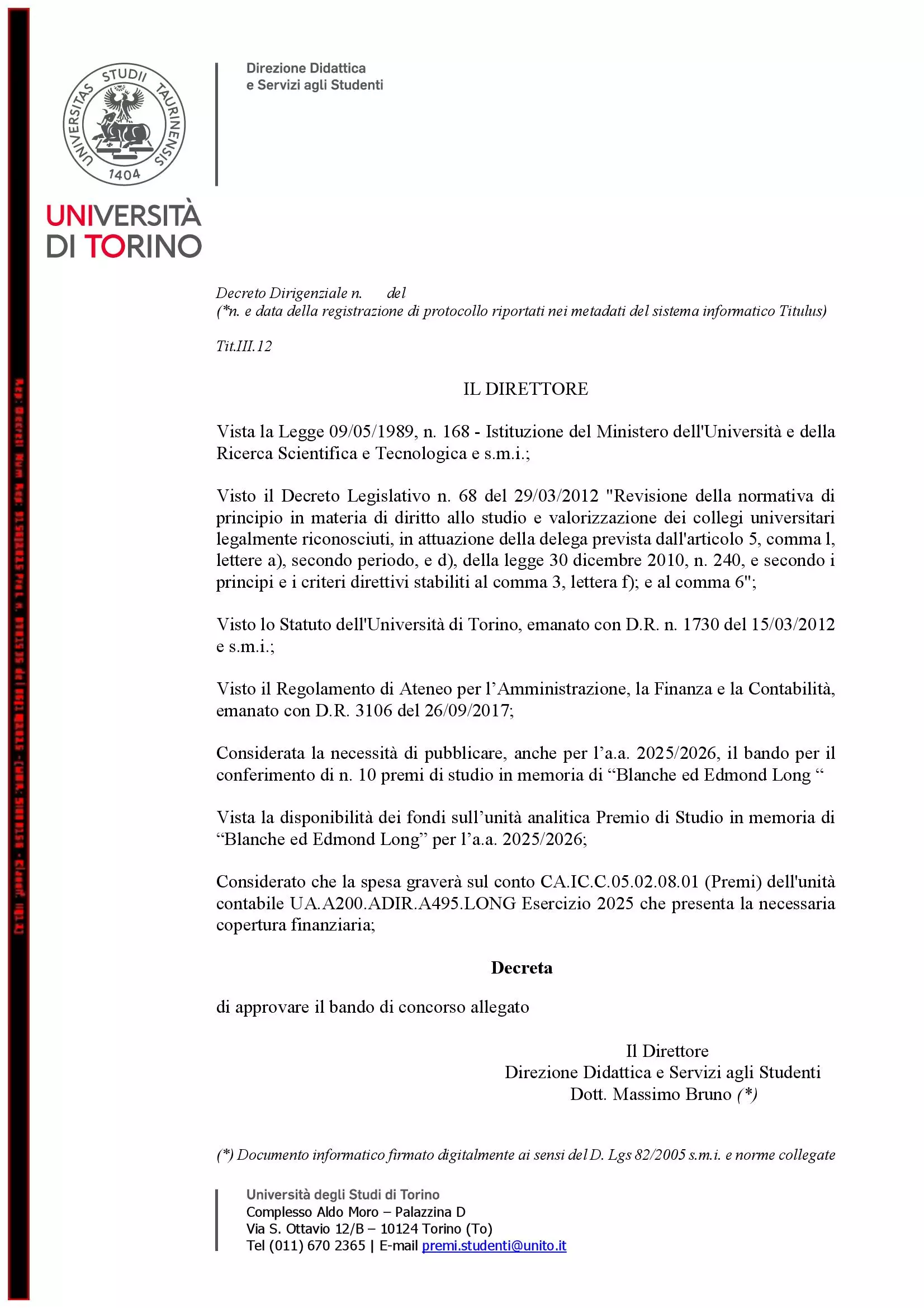 memoria di “Blanche ed Edmond Long” dell’importo unitario lordo di Euro 4.500,00 (soggetto alla ritenuta alla fonte per premi e concorsi del 25% ex art. 67 del T.U.I.R.) riservate a coloro che sono in possesso di tutti i requisiti indicati nel bando allegato.