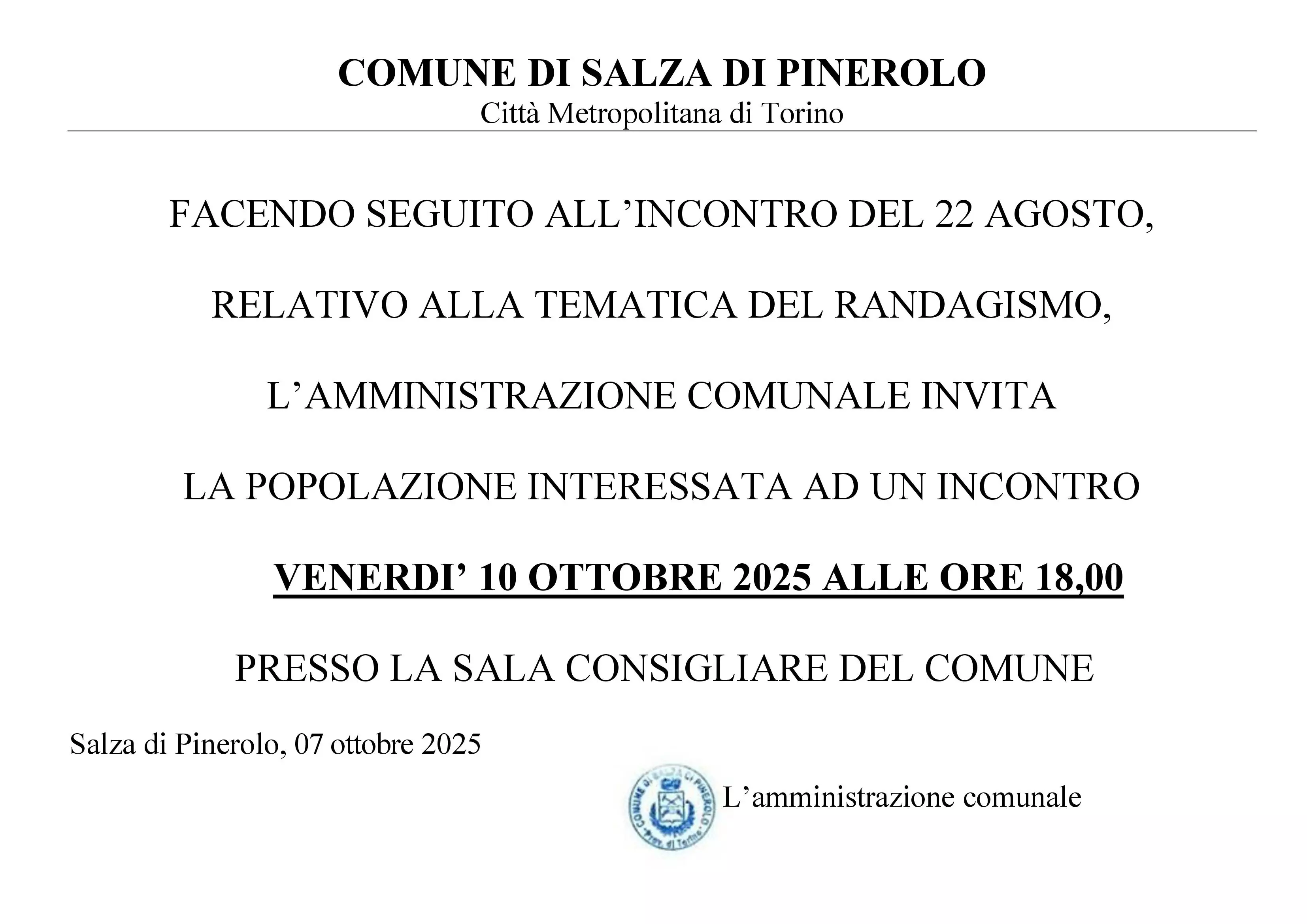 Descrizione FACENDO SEGUITO ALL’INCONTRO DEL 22 AGOSTO,RELATIVO ALLA TEMATICA DEL RANDAGISMO,L’AMMINISTRAZIONE COMUNALE INVITA LA POPOLAZIONE INTERESSATA AD UN INCONTRO VENERDI’ 10 OTTOBRE 2025 ALLE ORE 18,00 PRESSO LA SALA CONSIGLIARE DEL COMUNE